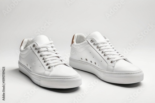 White sneakers, trainers isolated on white background. Unisex casual sports shoes. Top view. Space for text. Copy space.Stylish sport shoes. Trendy footwear