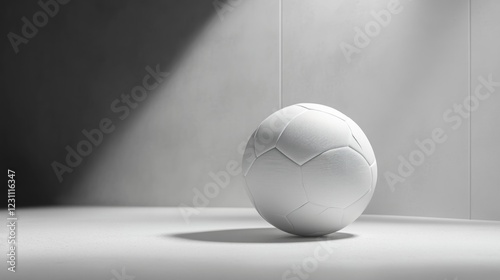 White soccer ball in spotlight, minimalist room, sports