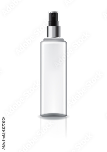 White square cosmetic bottle with spray head and silver ring for beauty or healthy product. Isolated on white background with reflection shadow. Ready to use for package design. Vector illustration.