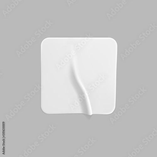 White square glued sticker mock up. Blank white adhesive square paper or plastic sticker label with wrinkled, crumpled effect. Blank template label tags. 3d realistic vector