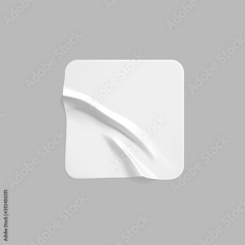 White square glued sticker mock up. Blank white adhesive square paper or plastic sticker label with wrinkled, crumpled effect. Blank template label tags. 3d realistic vector