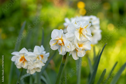 White tender narcissus flowers blooming in spring garden.