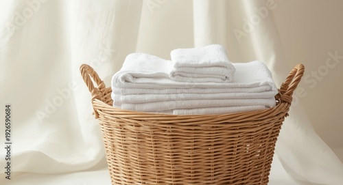 white towels folded inside a decorative basket for linen storage