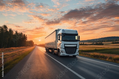 White truck driving on the asphalt road in rural landscape at sunset, ai