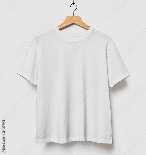 White T-shirt hanging on a wooden hanger, plain white background, mockup template stock photo. --ar 15:16 --v 6.1 Job ID: e497b093-57f6-4792-aea5-3e1ae1c80bbd