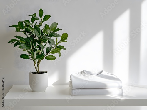 White t-shirt neatly folded on a white shelf with a minimalist plant pot nearby