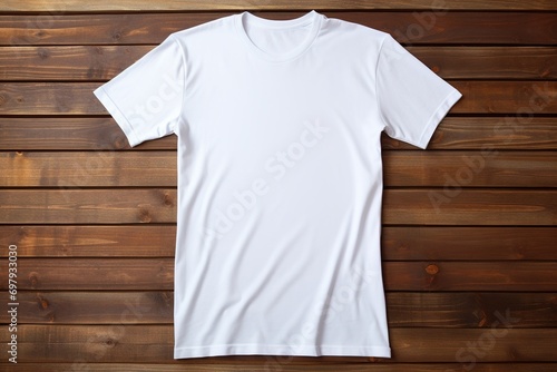 White t-shirt on wooden background, top view. Mockup for design