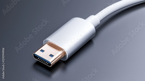 White USB-C cable close-up on dark surface. Technology website use