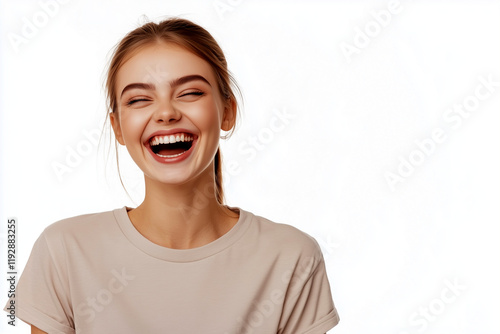 White woman joyful expression cream color t-shirt white background, laughing, cream t shirt, casual fashion, young woman, Caucasian woman, cheerful