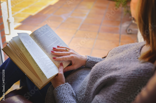 White woman reading a book in an armchair relaxing in nice daylight outside. Copy space. Reading, teaching concept.