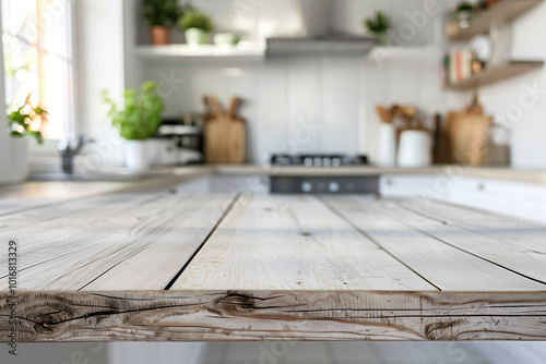 White wooden table top with a blurred kitchen interior background for product display.