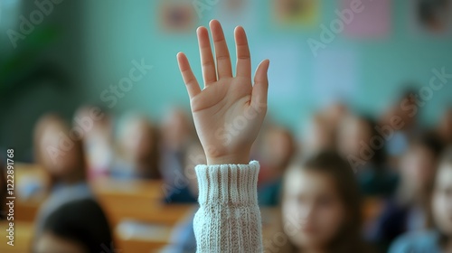 White-sleeved hand raises in classroom environment, representing participation and volunteering against blurred background with warm lighting and educational context.