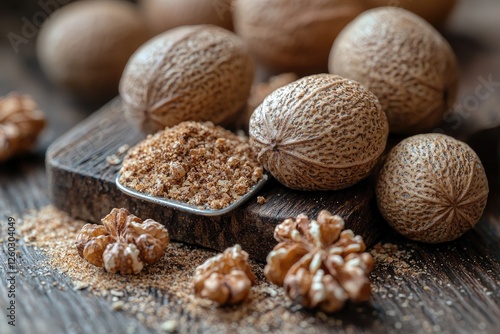 Whole and Ground Nutmeg with Walnuts on Wood