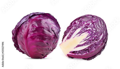 Whole and half red cabbage isolated on white background