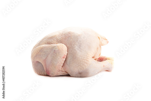Whole fresh raw chicken isolated on white background.