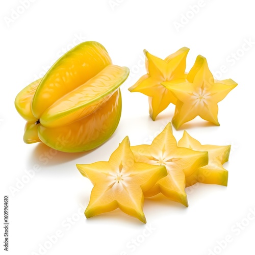 Whole starfruit (carambola) and sliced pieces, isolated on white background, high detail"