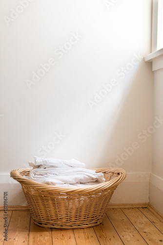Wicker laundry basket with folded white washing on wooden floorboards with light from adjacent window