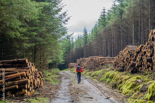 Wicklow way with logs stacked on the sides of the road and excursionist girl in the middle.