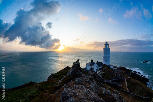 Wide angle landscape of lighthouse during sunrise in south Devon in a view from top of a rocky hill