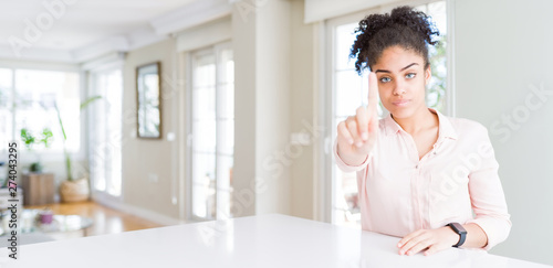Wide angle of beautiful african american woman with afro hair Pointing with finger up and angry expression, showing no gesture