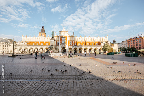 Wide angle view on the Market square with Cloth Hall building and Adam Mickiewicz monument during the morning light in Krakow, Poland