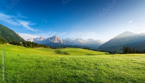 wide landscape scenery with beautiful green grass land and mountain range in the morning with copy space at side
