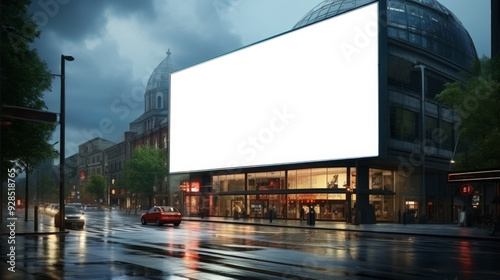 Wide White Billboard on Old Buildings on an European empty streets after the rain during the evening with blue and cloudy sky