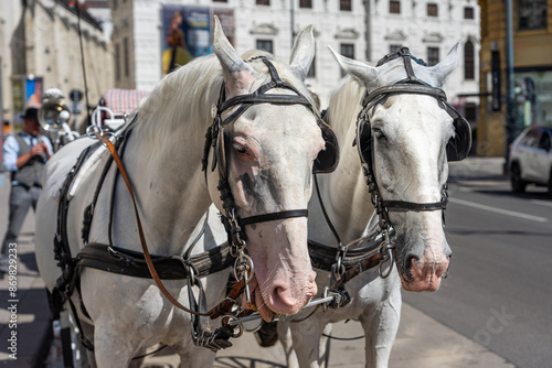 Wien, Innere Stadt: zwei Pferde im Portait, machen Pause, warten auf neue Fuhre, Kundschaft - Fiaker, Pferdekutsche