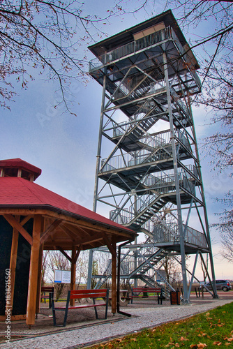 Wieża widokowa z widokiem na park, z metalowymi schodami i drewnianym zadaszeniem na otwartym terenie. Pietrowice Wielkie - wieża widokowa.