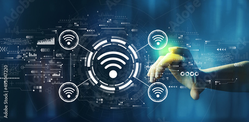 Wifi theme with hand pressing a button on a technology screen