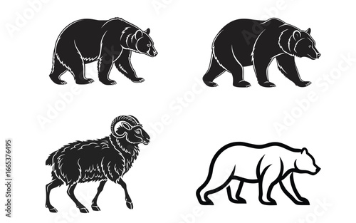 Wild Bear and Ram Vector Silhouette Illustration Set