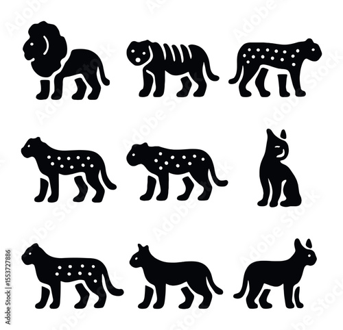 Wild Cat Icons. Solid, filled icons set of wild cats: lion, tiger, leopard, cheetah, jaguar, lynx, cougar,