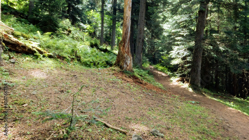wild green forest in mountain ridge - backpacking ground path - photo of nature