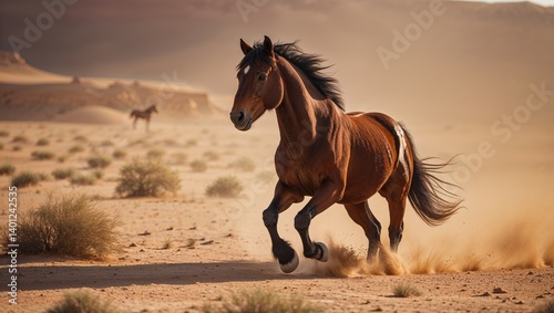 Wild Horse Sprinting Through Dry Desert Terrain at Sunset