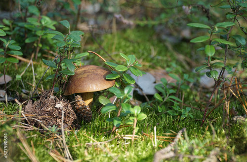 Wild mushroom (bay bolete) growing in natural forest in autumn among the green moss and the lingonberry in sunny day. Closeup. Selective focus.