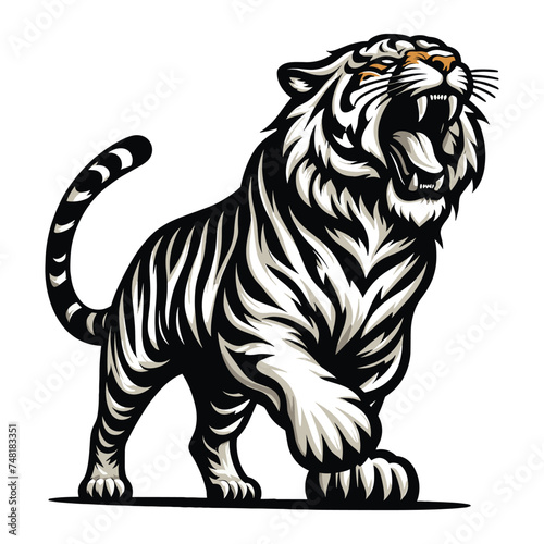 Wild roaring white tiger full body vector illustration, zoology illustration, animal predator big cat design template isolated on white background