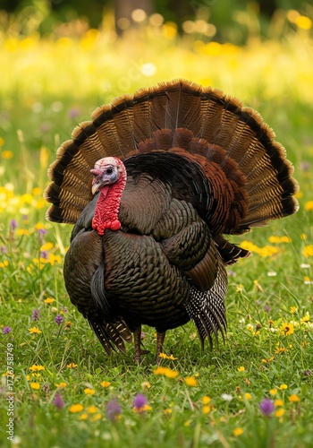 Wild Turkey Standing in Bright Flowered Meadow with Green Grass and Yellow and Purple Blooms