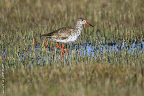 Wildlife-Birds. Spotted Redshank (Tringa erythropus) breeds in freshwater edge grasslands, wet meadows, pastures and coastal marshes. It feeds on flies, insects, small invertebrates.