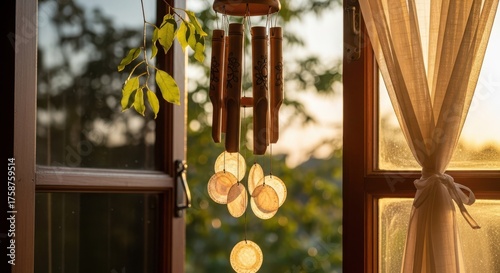 Wind chime hanging in an open window with a curtain, creating a peaceful and relaxing atmosphere at sunset