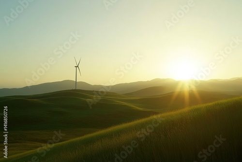 Wind farm at golden hour, sunlight shines through the rotating blades onto the green hills, showing the concept of renewable energy and sustainable development