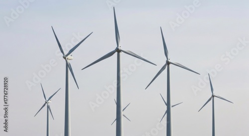 Wind farm with several turbines against a pale, clear sky