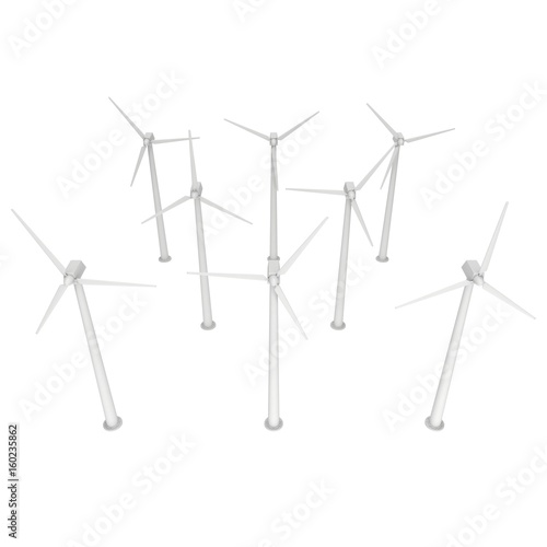 Wind turbine farm with propellers. Windmill generators 3D render isolated on white