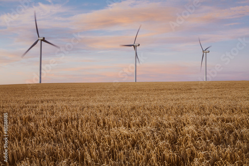 Wind turbines at dusk, field of summer wheat in foreground, Palouse, WA, USA