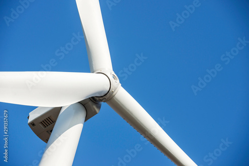 Wind turbines generating electricity with blue sky. Close up of Wind turbine producing alternative energy