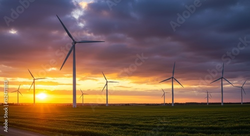 Wind turbines in green fields at golden sunset, clean energy landscape, dramatic sky.
