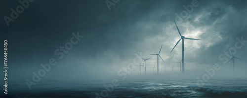 Wind turbines stand tall misty ocean scene symbolizing renewable energy expansion with calm yet powerful atmosphere inspiring sustainable progress