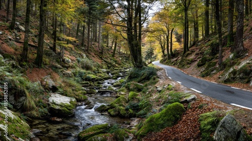 Winding forest road beside a rocky stream in autumn.