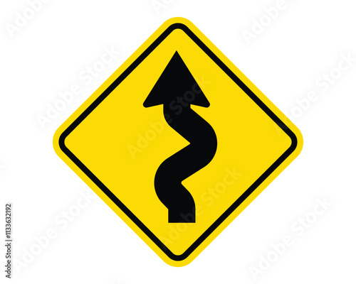 Winding Road Left Ahead Warning Sign Featuring a Yellow Diamond Shape with Black Curved Arrow, Indicating Multiple Left Turns, Available as a Vector File