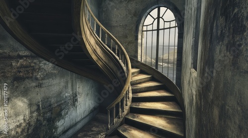 Winding Staircase Inside a Historic Lighthouse with Ocean View Through Window