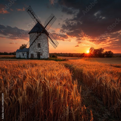 Windmill at sunset over golden wheat field